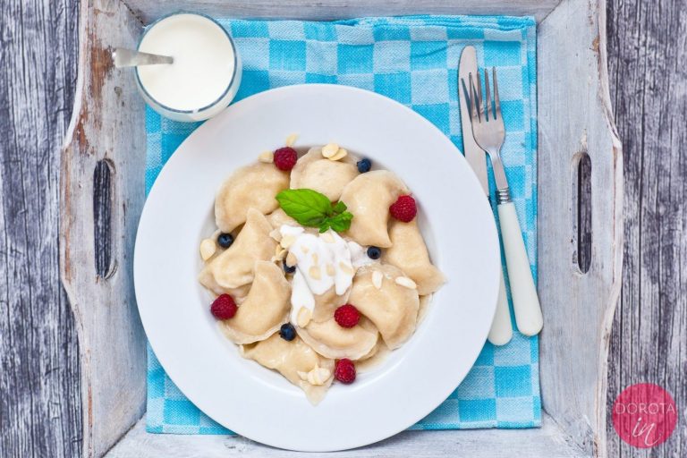Pierogi z serem można też podawać z dekoracją z owoców, np. truskawek, malin czy borówek. Świetnie będzie z nimi kontrastował sos cytrynowy lub pomarańczowy – to może być sos angielski na żółtkach lub po prostu jogurt wymieszany z sokiem wyciśniętym ze świeżych owoców lub zmiksowany z nimi.