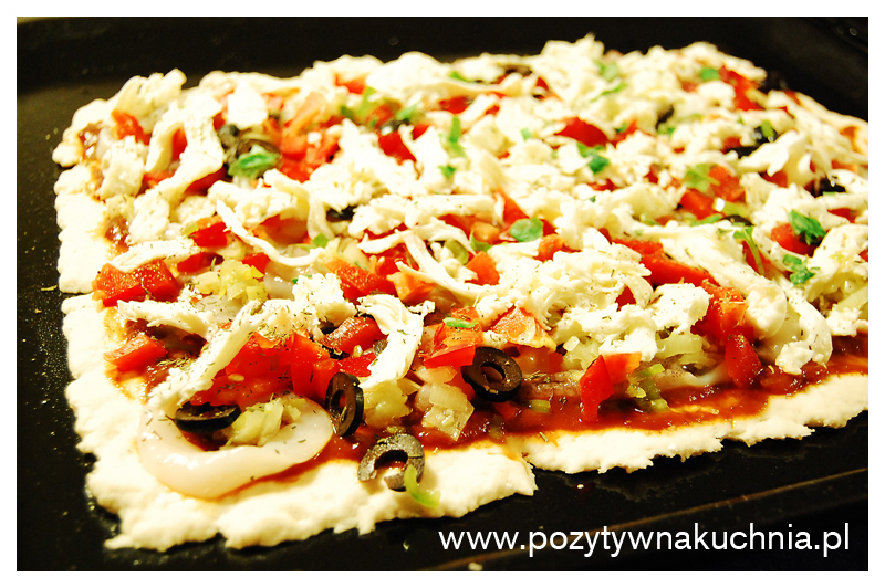 - Rozwałkowane ciasto smaruję sosem do pizzy i posypuję dodatkami na wierzch.