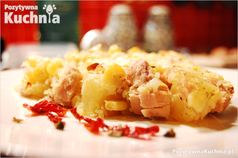 Zaglądam do szafki w poszukiwaniu tuńczyka, przy okazji wyjmuję puszkę kukurydzy. Spoglądam do lodówki – brak jakichkolwiek ciekawych składników. Sprawdzam koszyk na ziemniaki – są! A obok leży cebula. Zrobię placek z gotowanych kartofli, nie pójdę spać głodna. Placek z ziemniaków z tuńczykiem, kukurydzą. Pożywny, może odrobinę ciężki, więc nie warto najadać się do przesady. Ale na pewno warto przygotować, kiedy doskwiera głód, lodówka świeci pustkami, a za oknem pogoda, która nie zachęca do wyjścia choćby na małe, ekspresowe zakupy.