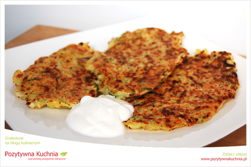 Placki cukiniowe z ziemniakami, podane ze śmietaną lub jogurtem.
