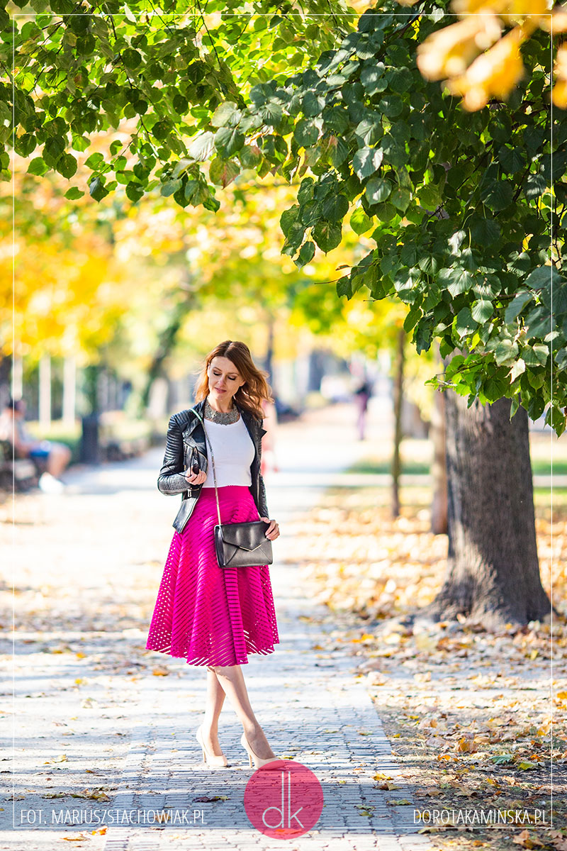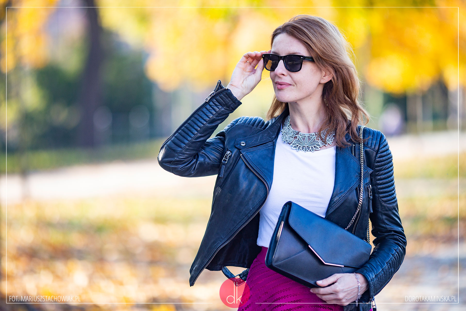 Nie ma drugiej takiej kurtki jak moja czarna skóra, którą mam od 2012 roku. Noszę ją przez cały rok: od wiosny do jesieni jako wierzchnie okrycie, a zimą zdarza mi się wykorzystać ją zamiast czarnej marynarki. Na pożegnanie słońca i złoto-żółtych barw purpurowa rozkloszowana spódnica – stylizacja z ramoneską na jesień. Jeden z moich ulubionych zestawów, który często zbiera komplementy nie tylko od znajomych, ale także od mijanych na ulicy, w parku czy sklepach osób.