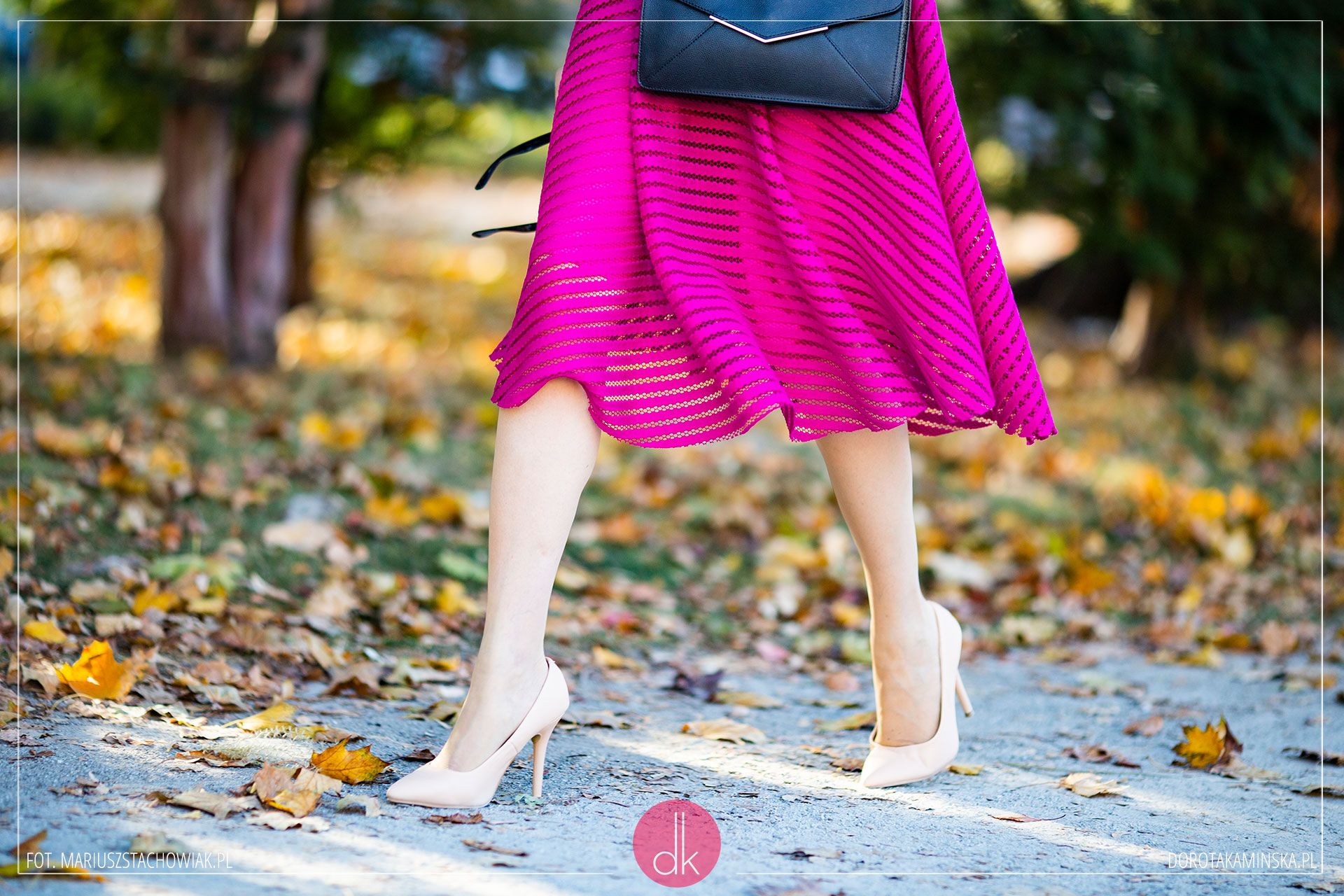Taka różowa rozkloszowana spódnica może się też świetnie sprawdzić w stylizacji na wesele. Wystarczy elegancka, ale w miarę prosta, biała bluzka, biżuteria i torebka kopertówka. Nosiłybyście?