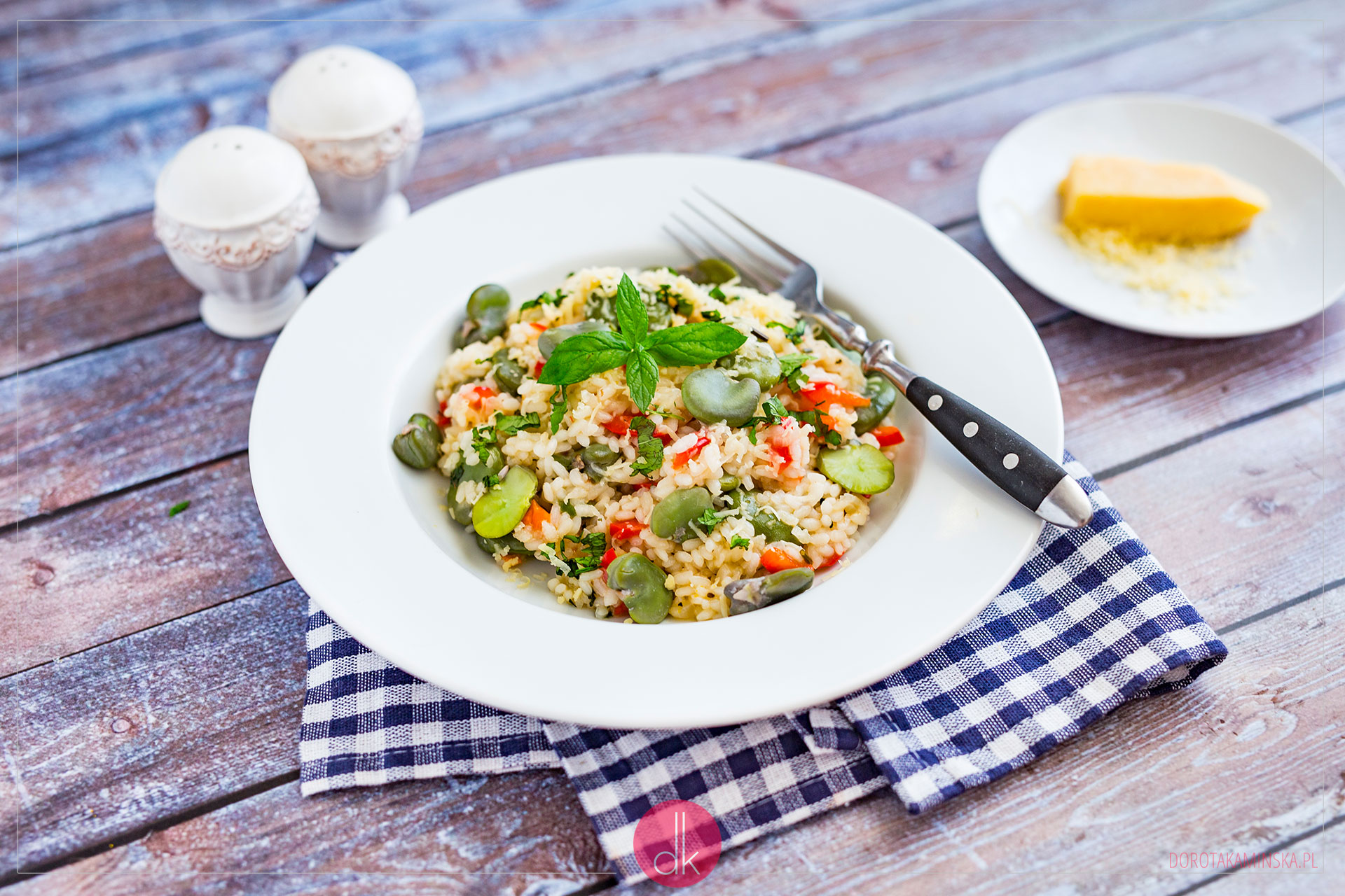 - Do ostatniej partii wywaru dodanego do risotto dołączam połowę bobu, mięty oraz całą paprykę.