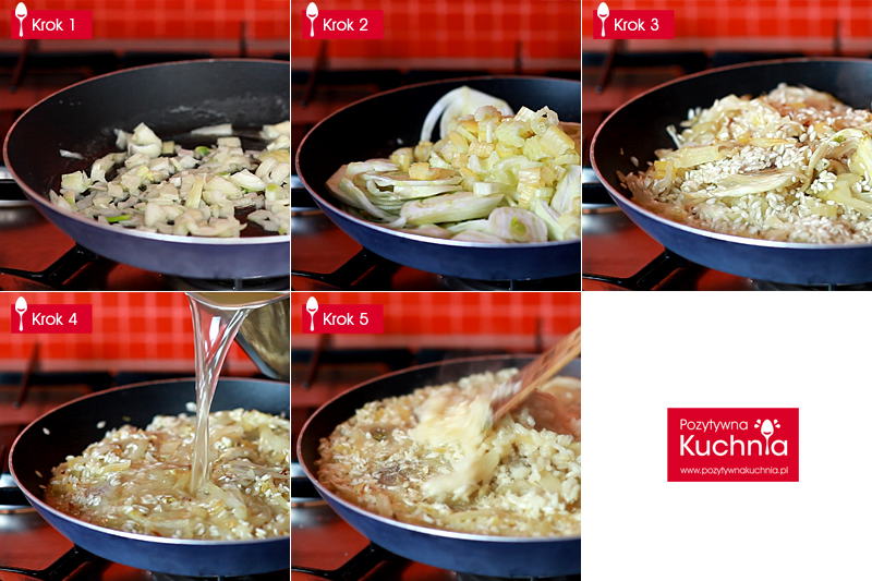 • Do warzyw dosypujemy ryż, cały czas mieszamy, aż zrobi się przezroczysty. Opcjonalnie - zalewamy winem i gotujemy aż do jego odparowania.