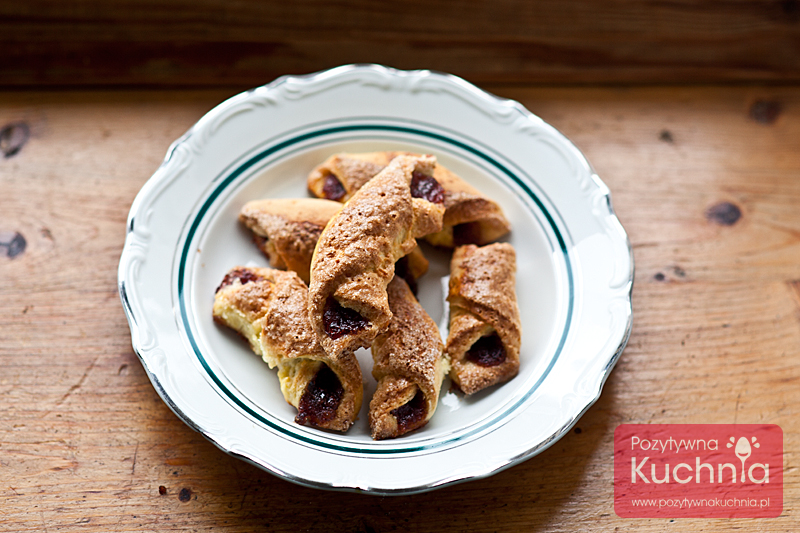 - Z kwadratów ciasta zawijam rogaliki, nadając im kształt prosty lub półksiężyców.