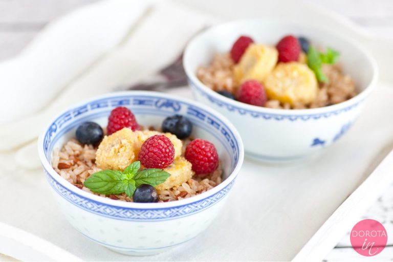 - 2 banany (dojrzałe, dokładnie rozduszone widelcem; zamiast dodatku bananów ryż można posłodzić, najlepiej 1/2 szklanki cukru brzozowego (ksylitolu lub syropu z agawy))