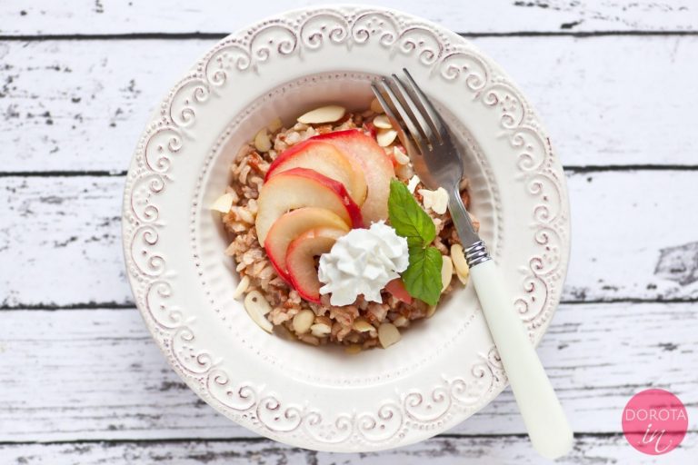 Jeden z prostszych, letnich obiadów to ryż z jabłkami – tani, łatwy do przygotowania, a jeśli nie na obiad, można go zjeść na deser i pewnie wielu z Was pamięta tę potrawę z dzieciństwa, bo nie tylko moja babcia karmiła mnie ucieranymi jabłkami, do których dodawała przeróżne smakołyki. Niejeden raz opowiadałam, jakim byłam niejadkiem do mięsa, za to pierogi ruskie, knedle ze śliwkami i wszelkie potrawy mączne: placki, naleśniki, kluski, kopytka – uwielbiałam.