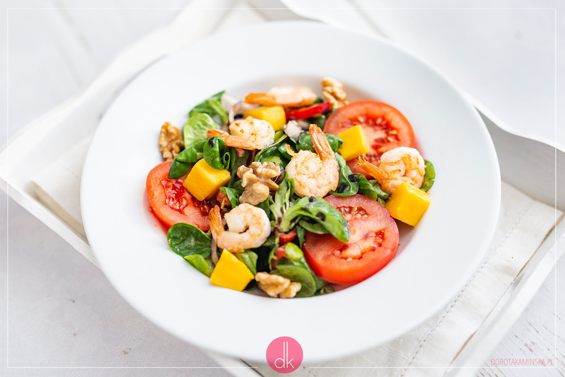 To smak, który kojarzy mi się z wakacjami. Jednak nawet pod koniec lata nadal można ją przygotować, ciesząc się smakiem dojrzałego mango i pysznych pomidorów. Słodkość koniecznie trzeba przełamać czymś kwaskowatym, dlatego proponuję dodatek soku z limonki lub pomarańczy. Odrobina chrupiących, delikatnie uprażonych orzechów lub migdałów, może świeże zioła, np. kolendra lub mięta, choć nieobowiązkowo… I eleganckie danie na letnią lub jesienną, romantyczną kolację dla dwojga, jest gotowe w 10 minut! Sałatka z krewetkami z mango, a do tego może jakaś tostowana bagietka. Do tego wino w kieliszku i miłe towarzystwo przy stole. Czy można chcieć więcej?
