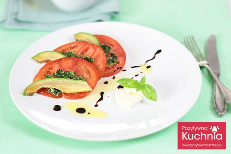 • Pomidora smaruję pesto i razem z awokado i mozzarellą układam dekoracyjnie na talerzu. Skrapiam octem winnym lub balsamicznym.