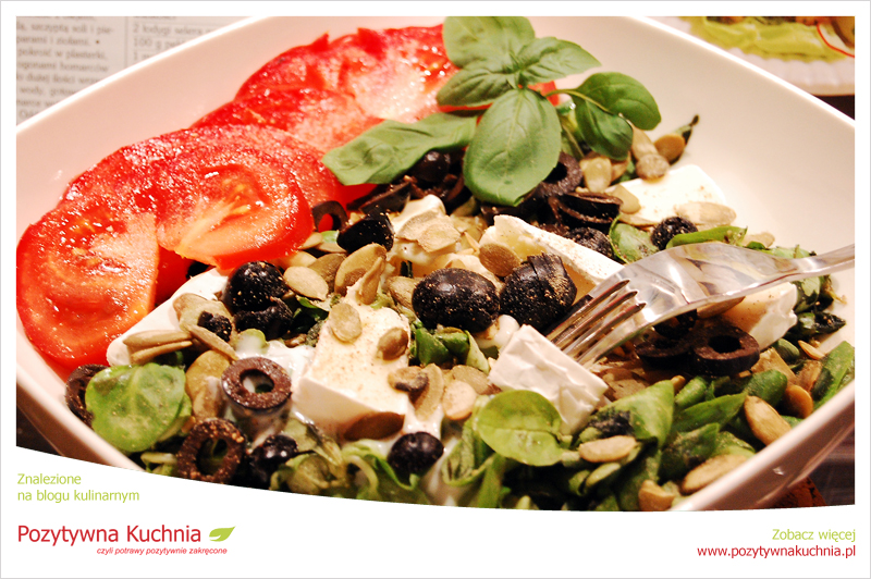 Jaki los spotkał drugie opakowanie roszponki? Wylądowała w misce: oto sałatka z roszponki z serem pleśniowym, pomidorem, oliwkami i pestkami z dyni. Prosta, smaczna i pożywna, a do tego – szybka do zrobienia.