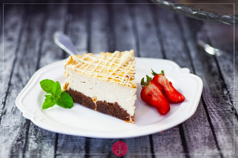 Sernik chałwowy delikatny i kremowy, na spodzie z ciasteczek czekoladowych, z polewą z białej czekolady, która idealnie uzupełnia smak chałwy.