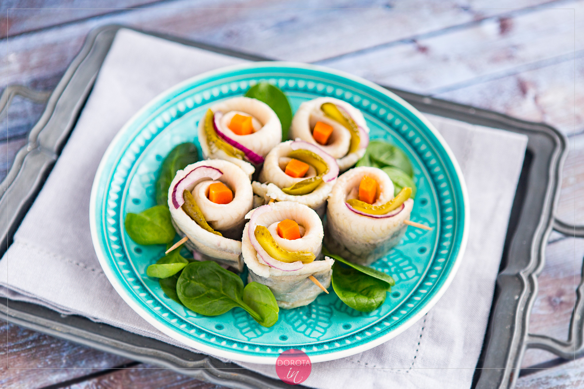 - Owijam śledzie wokół marchewki lub jajka i spinam wykałaczką.
