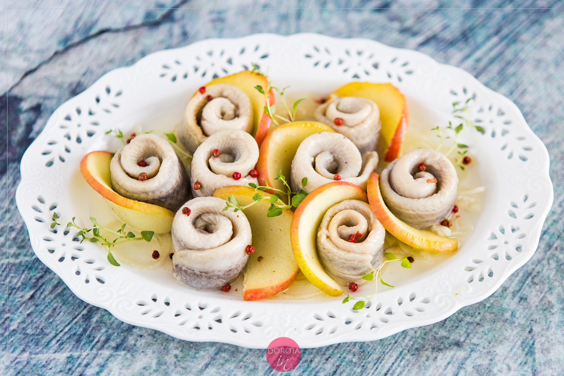 - Śledzie zawijam w ślimaczki i serwuję z cebulą i olejem z zalewy, posypane czerwonym pieprzem i udekorowane plastrami gruszki i gałązkami tymianku.