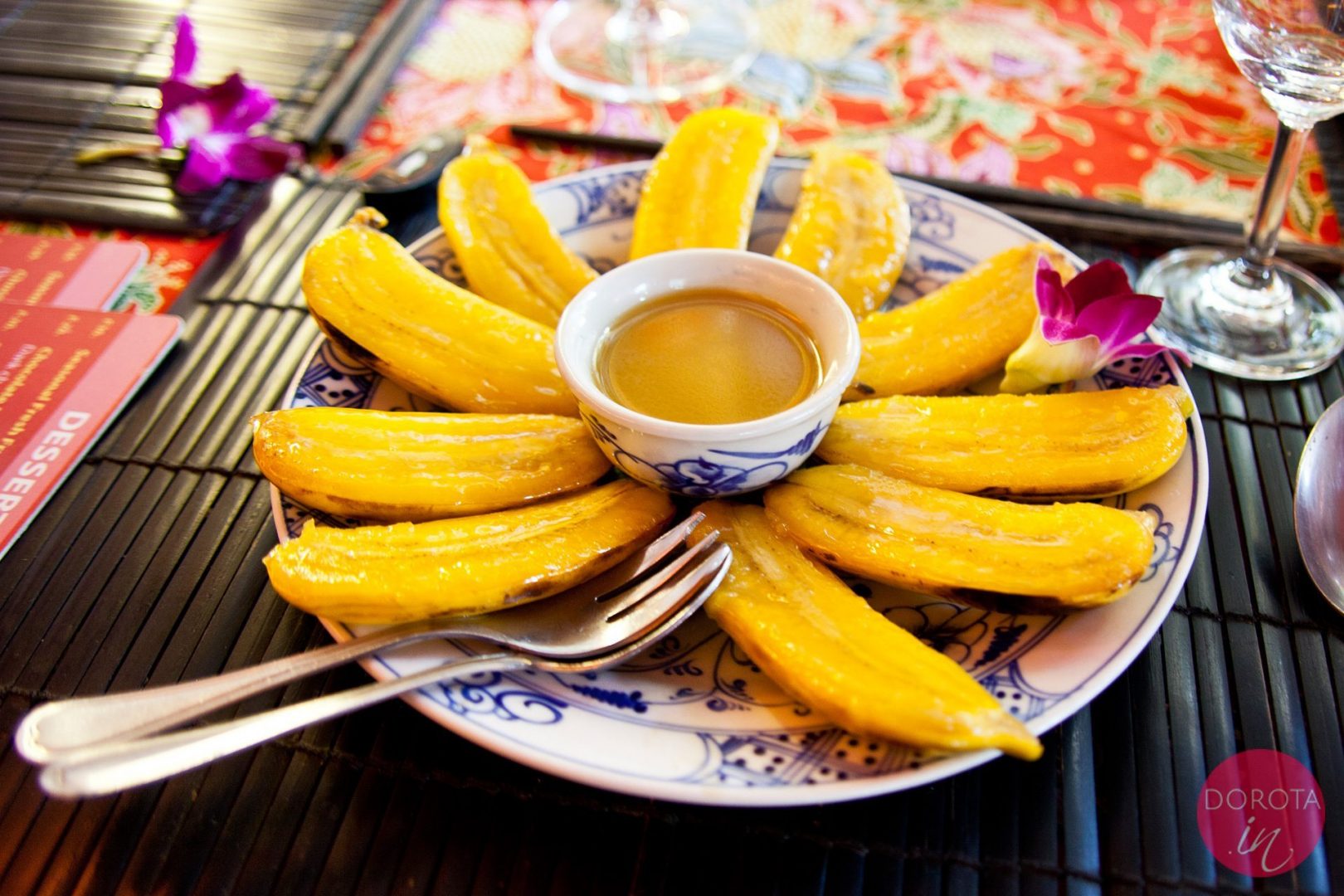 Kiedy podróżuję po świecie, kosztuję lokalnej kuchni, udając się do miejsc, w których stołują się miejscowi. Korzystam z dobrodziejstw przyulicznych sprzedawców, którzy gotują na miejscu, zawsze ze świeżych produktów, a przygotowywane przez nich potrawy są proste i smaczne. Bywa jednak i tak, że jadam w restauracjach, czasem nawet takich typowo dla turystów. W Kambodży stołowałyśmy się w miejscu, do którego zawiózł nas nasz przewodnik. Smażony banan z miodem i mlekiem kokosowym to jedno z dań odkrytych w restauracji, która nie była szczególnie elegancka i wyszukana, ale oferowała jedzenie pyszne, świetnie doprawione i pięknie podane.
