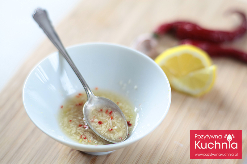 - Sok z cytryny mieszam w miseczce z cukrem i sosem rybnym.