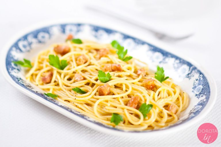 Super przepis. Ja robię troszeczkę inaczej carbonare, aczkolwiek zamierzam wypróbować i Twój sposób. Mój przepis różni się tym, że na samym końcu smażenia boczku dolewam białe najlepiej półwytrawne wino (odrobinę ze 100-150ml, [czekam aż trochę odparuje] – reszta butelki do wypicia z partnerką przy pysznym włoskim daniu :-), a do jajek oprócz sera soli i pieprzu, dodaję odrobinę śmietany 18% i natkę zielonej pietruszki.