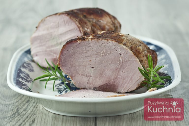 • Mięso przekładamy do wysokiego, żaroodpornego naczynia i obkładamy kawałkami smalcu i wstawiamy do piekarnika nagrzanego do 200 °C. Pieczemy przez 15 minut.