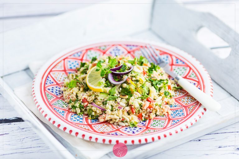 W niektórych wersjach tabbouleh zawiera ostrą papryczkę chili lub jajka. Moja propozycja to klasyczny skład i odrobina orzeszków piniowych, które, opcjonalnie, można zastąpić np. pistacjami lub prażonymi migdałami. Szkoda, że pęczki natki pietruszki, które kupiłam, były tak niewielkie, bo im bardziej zielona jest ta sałatka, tym lepiej!