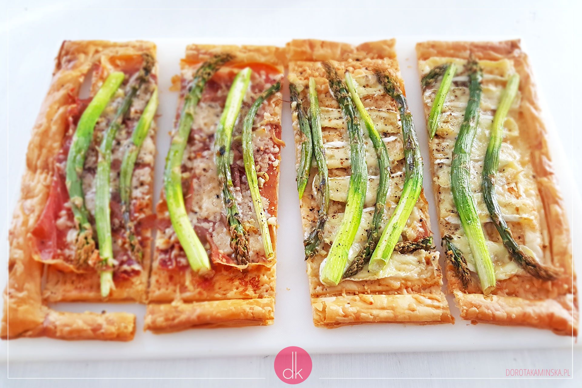 To jeden z przepisów „awaryjnych”, kiedy trzeba przygotować coś do zjedzenia dla siebie i znajomych, którzy mają wpaść z niespodziewaną wizytą lub na co dzień, żeby nie wykonywać w kuchni zbyt wielu prac po powrocie do domu. Tarta ze szparagami na cieście francuskim, z dwoma serami i szynką parmeńską, którą można dołożyć opcjonalnie, gdy nie jest konieczne przygotowanie posiłku bez mięsa. U mnie wersja wegetariańska na jednej połowie :).