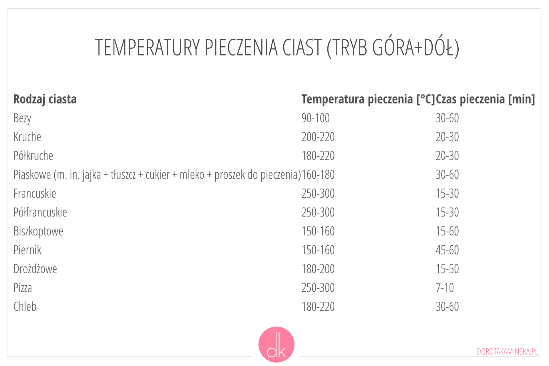Podane poniżej temperatury dotyczą pieczenia w trybie „góra+dół”. Niektóre ciasta, np. bezy, biszkoptowe, piaskowe, dobrze pieką się w trybie „termoobiegu” i przy tym sposobie wypieku warto obniżyć temperaturę pieczenia o ok. 10-20 °C.