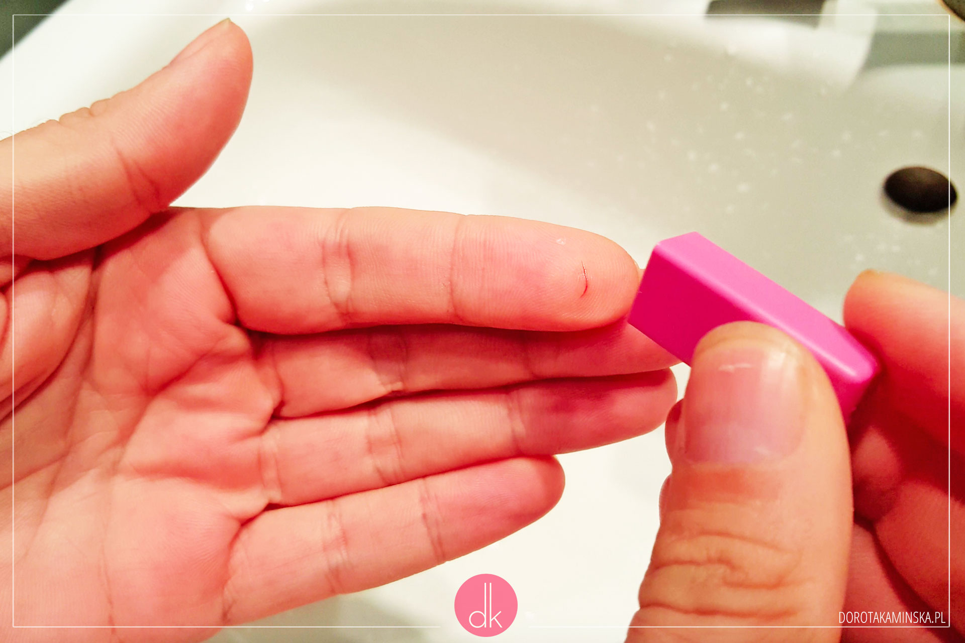 Palec nakłuwa się specjalnym różowym przyrządem. To nakłuwacz, który strzela w skórę specjalną blaszką nacinającą naskórek.