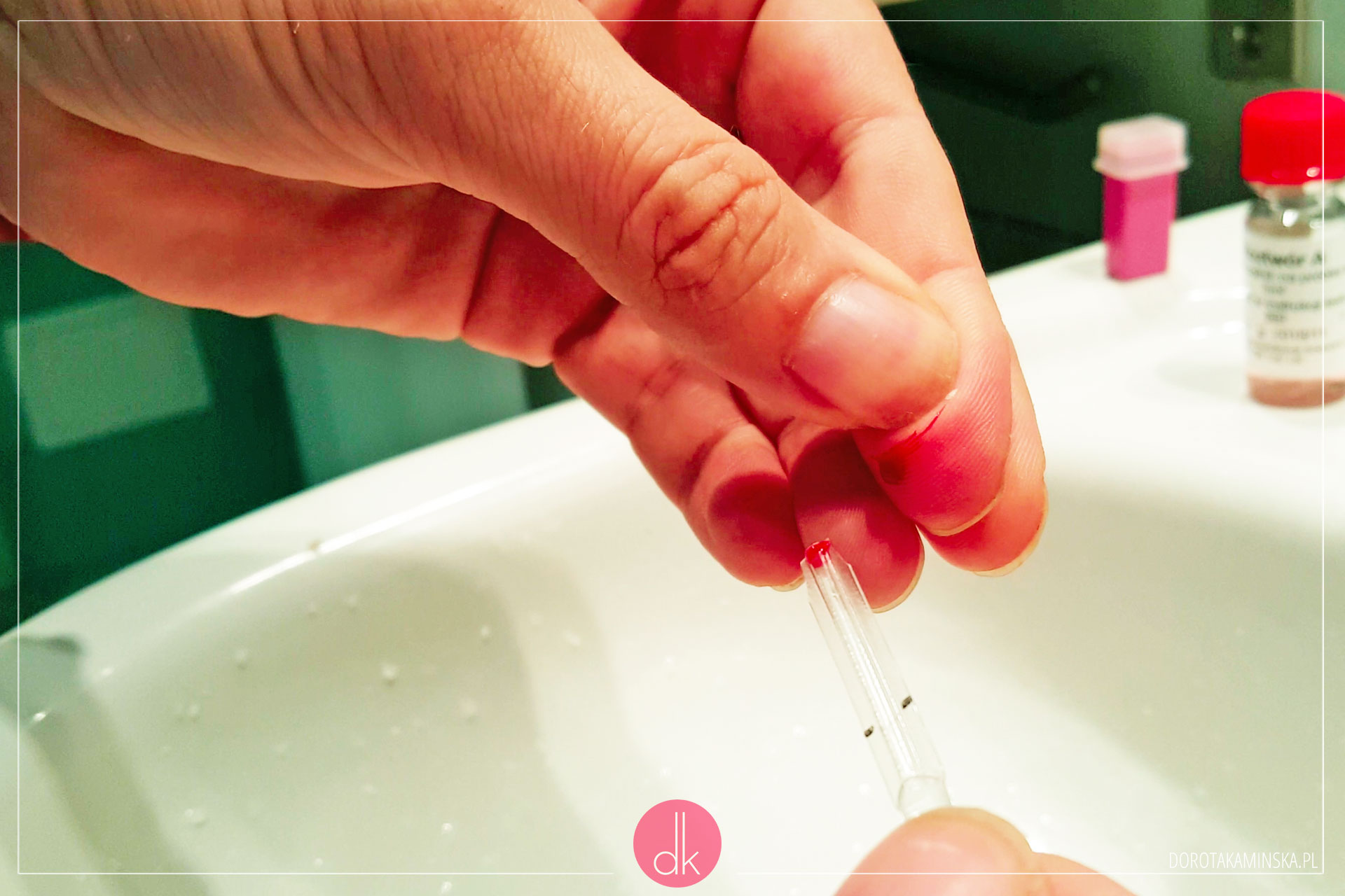 Dobra rada: sprawdźcie, czy na pewno macie w dniu wykonywania testu odpowiednie ciśnienie. Jeśli jest niskie, pochodźcie wcześniej po domu, pobiegajcie… Wypijcie kawę. Bo mojemu partnerowi krew prawie nie chciała lecieć z palca po przekłuciu i nie było łatwo zebrać jej wystarczającej ilości. Zużyliśmy oba przyrządy do nakłuć i obie pipetki. Ostatecznie się udało.