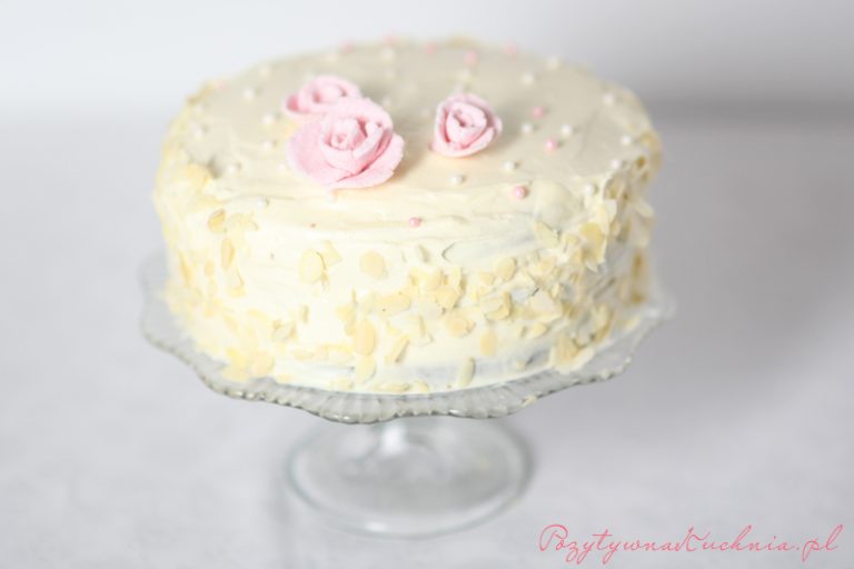 • Obsypuję tort płatkami migdałów, a wierzch dekoruję perełkami cukierniczymi i różyczkami z lukru plastycznego.