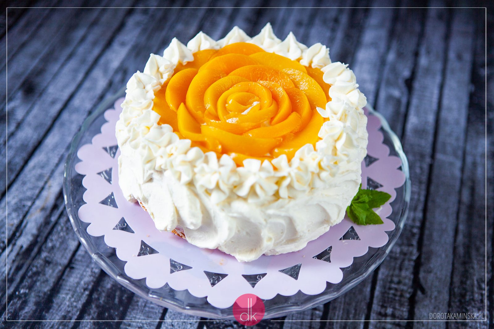 - Na wierzchu tortu układam plasterki brzoskwiń w kształt róży. Zaczynam od ułożenia małego ślimaczka z mniejszych plasterków na środku i dokładam kolejne dookoła.