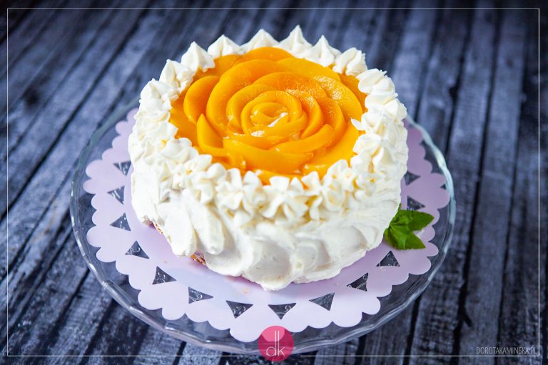 Po kilku dniach po urodzinach, na spokojnie, upiekłam drugi tort, żeby móc go sfotografować i podzielić się z Wami przepisem. Udoskonaliłam sposób dekoracji, choć tym razem zapomniałam dodać mak lub migdały do masy biszkoptowej. Upieczony na zwykłej mące tortowej, za to ze starannie pokrojonymi brzoskwiniami i domowym dżemem malinowym na wszystkich warstwach, choć pomarańczowy sprawdziłby się tutaj równie dobrze. Uważam, że mój tort brzoskwiniowy wyszedł piękny, chociaż jego bok nie do końca przypomina to, co w mojej głowie stworzyła przed nakładaniem masy wyobraźnia ;).