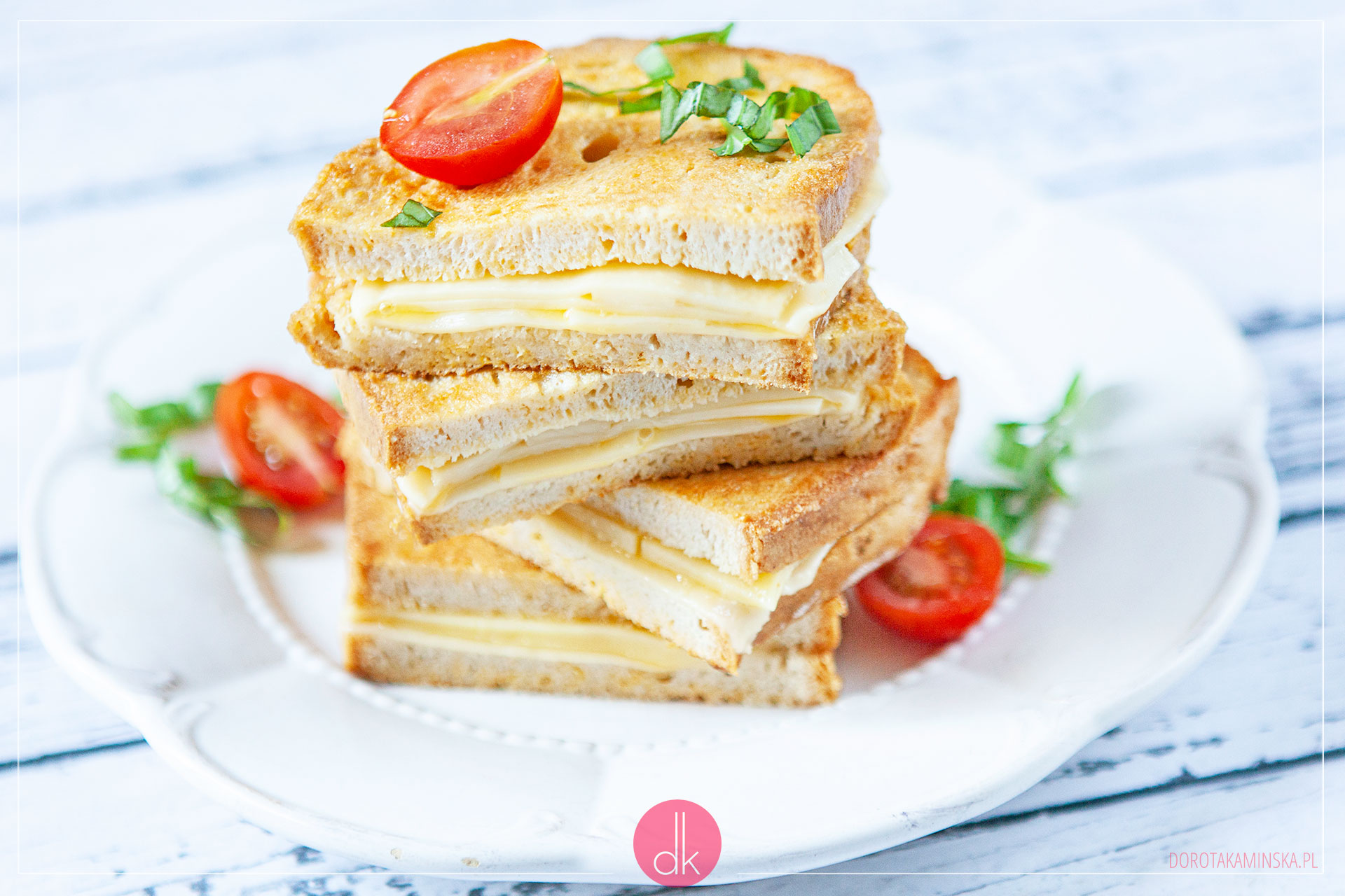 Tosty w jajku pamiętam z czasów dzieciństwa i wyjazdów do babci. Smażyła je moja ciocia Danuta, dosypując do jajka suszone zioła, a czasem dolewając odrobinę mleka. Pokazała mi jak zrobić tosty w jajku z przesuszonego chleba. Dzięki wymoczeniu suche kromki dostawały drugie życie, a dodany potem do środka ser cudownie się rozpuszczał i ciągnął w czasie jedzenia. Zwykły, żółty ser nadawał się do tego wtedy najlepiej! Dziś polecam spróbować też z mozzarellą. Do tego z pewnością koniecznie pomidor lub małe pomidorki koktajlowe. Co powiecie na takie śniadanie?