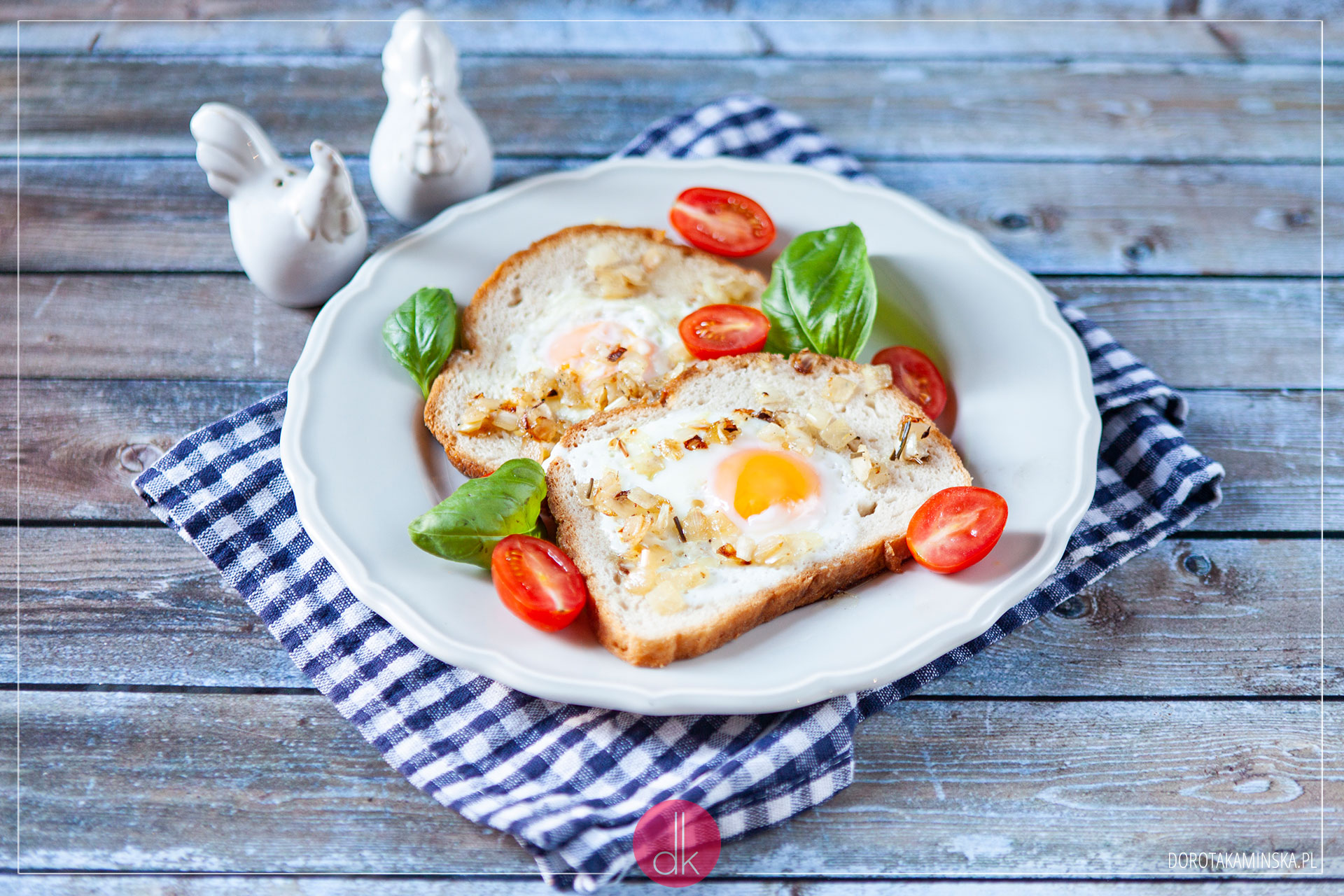 Muszę Wam opowiedzieć historię ich przygotowania. Nie wiem, czy też bywacie tak rozkojarzeni podczas robienia zakupów. Mnie, nawet z listą w ręku, zdarza się ciągle czegoś zapomnieć. I o ile w kuchni jestem kreatywna i potrafię wyczarować coś smacznego, robiąc przegląd lodówki, o tyle nie da się wyczarować tostów z jajkiem, kiedy zapomniało się kupić jajek ;). Wykroiłam otwory w kanapkach. Rozgrzałam tłuszcz na patelni. Na drugiej, mniejszej, zeszkliłam cebulę. I zorientowałam się, że po jajka będę musiała natychmiast pobiec do pobliskiego sklepu. Potem, kiedy już wbiłam je do podsmażonych na patelni kromek, zorientowałam się, że kromki warto byłoby najpierw odwrócić ;).