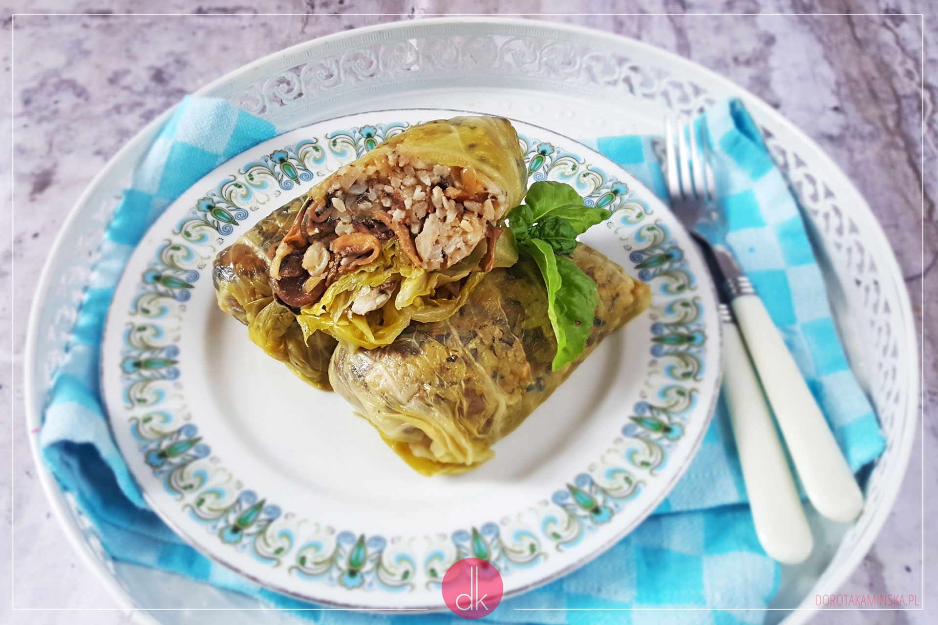 Układam farsz na środku każdego liścia kapusty, ściskam ręką w kształt grubego walca i zawijam gołąbki. Najpierw można zawinąć boki, a następnie rolować kapustę od dołu ku górze. Farsz musi być dobrze zawinięty, żeby nie wypadł z gołąbków podczas gotowania.