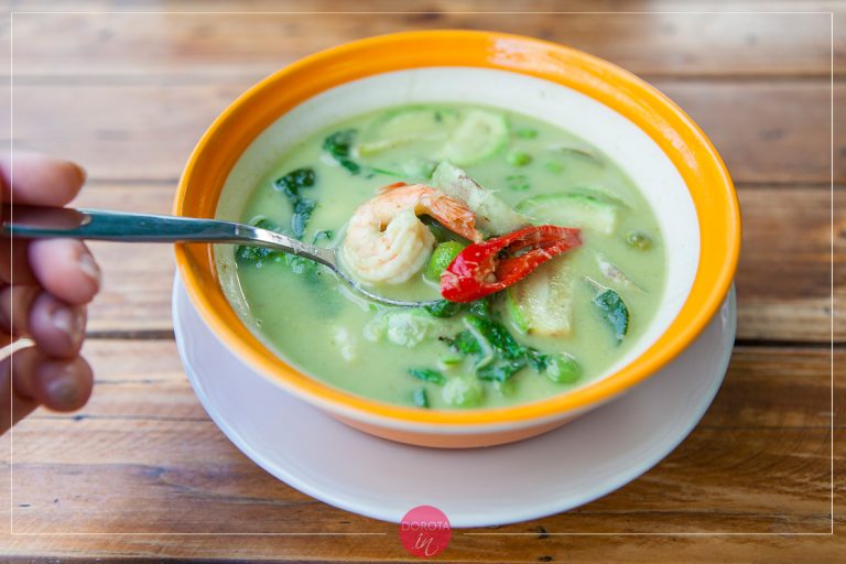 Jedna ze smaczniejszych potraw, jakie kiedykolwiek jadłam! Choć wiem, że może, bardziej niż ze względu na smak, mam do niej sentyment, wspominając niejedną azjatycką podróż. Te ulice przepełnione milionem aromatów, sosy gotowane w dużych garnkach i mięsa obsmażane na szybko. Zabieram Was dziś w podróż kulinarną do Tajlandii. Jedną z najpopularniejszych potraw serwowanych tam turystom jest zielone curry, przygotowane na bazie mleka kokosowego i zielonej pasty curry. To doskonałe i proste do odtworzenia we własnej kuchni danie. Zobaczcie jak zrobić zielone curry tajskie: green curry z krewetkami lub innym dodatkiem.