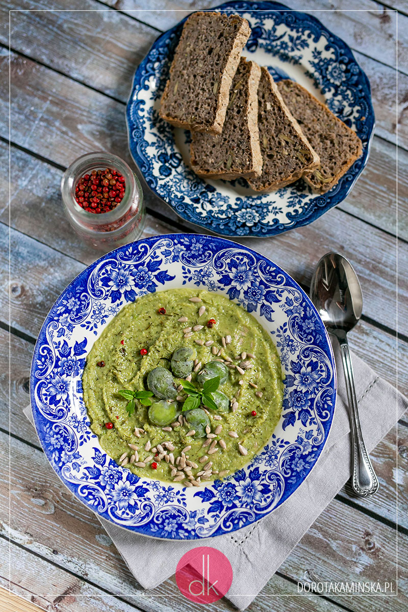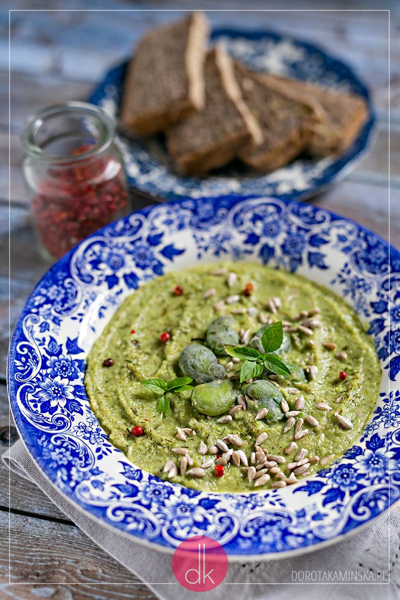 Polecam zostawić odrobinę blanszowanego bobu do dekoracji: będzie ugotowany „al dente” czyli lekko twardy, ale w takiej formie można go spokojnie zjeść. Dla kontrastu kolorystycznego trochę ziarnistego, czerwonego pieprzu, delikatnie uprażony słonecznik, który będzie przyjemnie chrupiący oraz oczywiście świeże, pachnące zioła: mięta lub koperek, albo bazylia. Co kto lub – ciekawa jestem Waszego wyboru!