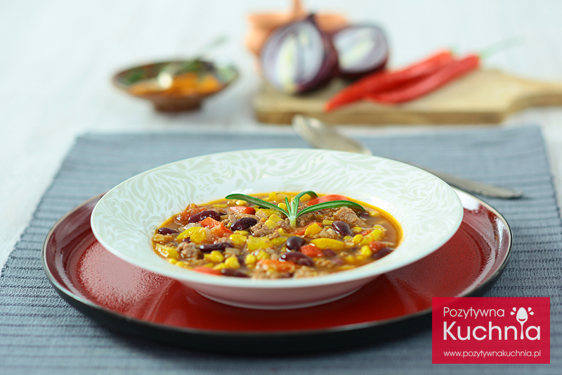 Jest to pierwszy przepis zapisany w moim własnym zeszycie kulinarnym i pierwsza „niepolska” zupa, jaką przygotowałam kilkanaście lat temu, pod czujnym okiem mamy mojego kolegi, w czasie wspólnych wakacji. Zupa meksykańska przypomina chili con carne (które również bywa nazywane zupą, choć w konsystencji bliżej mu raczej do gulaszu), ale jest od niego nieco rzadsza i bogatsza o dodatek kukurydzy, wywaru oraz czerwonego wina.
