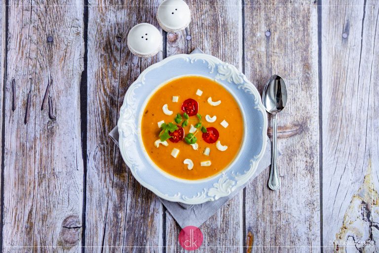 Zupa z batata może być udekorowana na wiele sposobów. Najprościej zrobić na niej białe kleksy z mleka kokosowego lub śmietanki i posypać lekko uprażonymi nerkowcami. Polecam jednak dorzucić plasterki limonki lub pomarańczy, albo pomidory i posypać świeżo siekaną kolendrą. Będzie piękny kontrast kolorów!