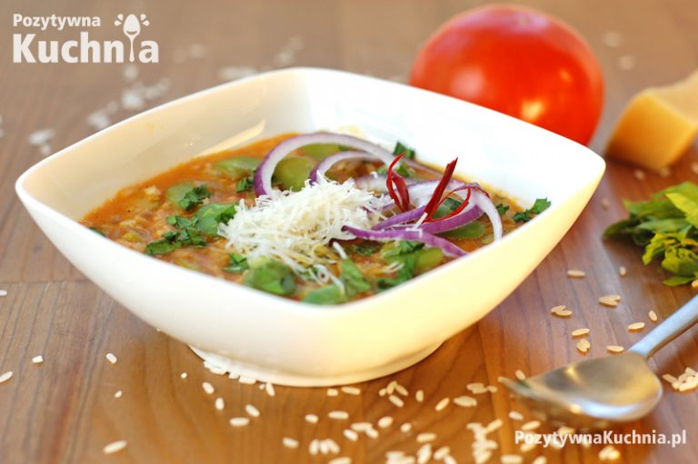 Łagodna w smaku zupa z bobu, świetna w letnim sezonie. Warto przygotować ją pod wieczór i podać lekko odgrzaną, następnego dnia. Choć jest dość gęsta, łatwo rozcieńczyć ją wodą, wywarem warzywnym lub drobiowym. Dzięki zawartości ryżu i bobu zupa jest bardzo pożywna, a charakteru dodają jej czerwona papryczka i utarty parmezan.